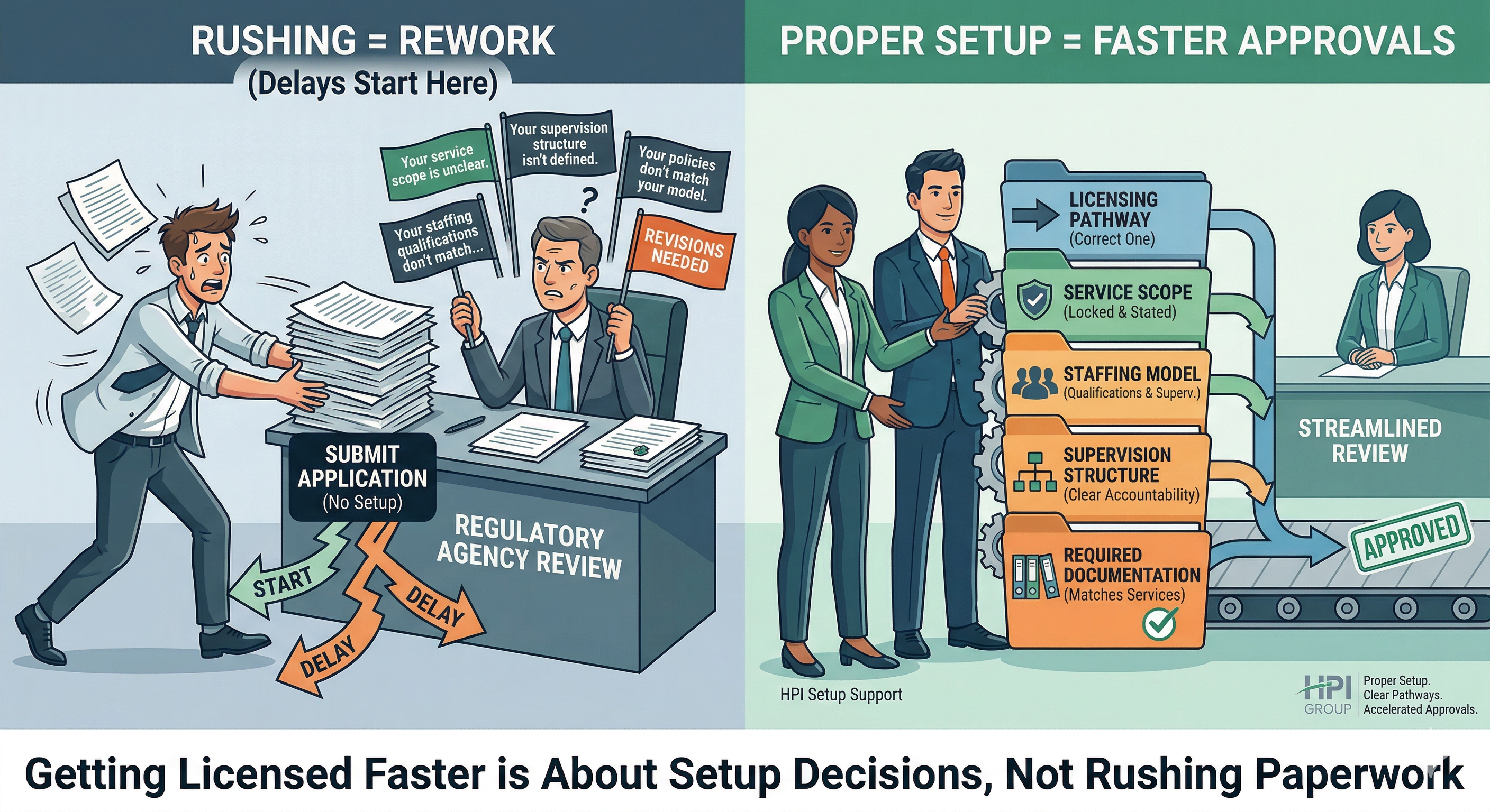 Where HPI comes in (setup only) This is exactly what HPI does before application submission: reduce delay by tightening setup. HPI supports agencies by aligning: the correct licensing / accreditation pathway to your service scope staffing qualifications and supervision structure to the services required documentation to what you will actually provide the full application submission package so it reads consistent and reviewable That is how you move faster without rushing. Bottom line If you want to get licensed faster, don’t rush the application. Rushing produces rework. Proper setup produces approvals. When your service scope, staffing qualifications, supervision structure, and required documentation align to the right licensing pathway, licensing moves as fast as it realistically can.