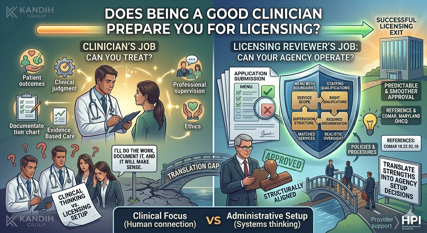 What DOES translate well from clinician to administrator Clinicians are not starting from scratch. You already have strengths that matter in licensing setup: You understand risk and accountability You respect documentation and consistency You know why supervision matters You can design workflows that protect clients The shift is learning to translate those strengths into agency setup decisions. A simple way to know you’ve switched into “administrator mode” You’re thinking like an administrator when you can answer these clearly: What is our service scope (and what are we not offering)? Do staffing qualifications match that scope? Is supervision structure clear and realistic? Do policies match the exact services we’re applying to provide? Does the application submission tell one consistent story? When those answers are clear, licensing becomes easier. Where HPI comes in (setup only) This is exactly where clinician-owners benefit from support—before submitting. HPI helps clinicians shift from “clinical thinking” to “licensing setup thinking” by helping you: choose the correct licensing / accreditation pathway define service scope with clear boundaries align staffing qualifications and supervision structure align required documentation (policies) to the real operating model That prevents returned or delayed application submissions caused by mismatched setup decisions. Bottom line Being a good clinician is a strong foundation for running a healthcare agency. But licensing requires a second skill set: administrative setup—service scope, staffing qualifications, supervision structure, and required documentation aligned to the right pathway. Once you treat licensing as agency design (not paperwork), it becomes far more predictable.