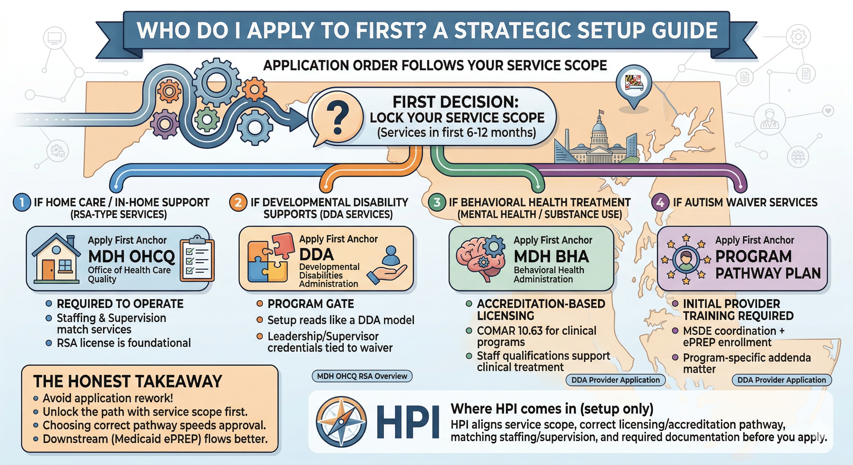 Why “application order” changes from agency to agency Some agencies only need one regulator to approve a license. Others need multiple approvals because they’re touching different systems: MDH (Maryland Department of Health) licensing (often through specific offices like OHCQ or BHA) DDA provider approval for developmental disability services MSDE involvement for Autism Waiver provider readiness/training Medicaid enrollment to get paid (ePREP) Those are not duplicates. They are different layers: permission to operate, program participation, and payment. The simplest way to choose the right “apply first” path Use this plain-language guide. It’s intentionally high-level—this is about planning, not a step-by-step checklist. If your services are home care / in-home support (RSA-type services)