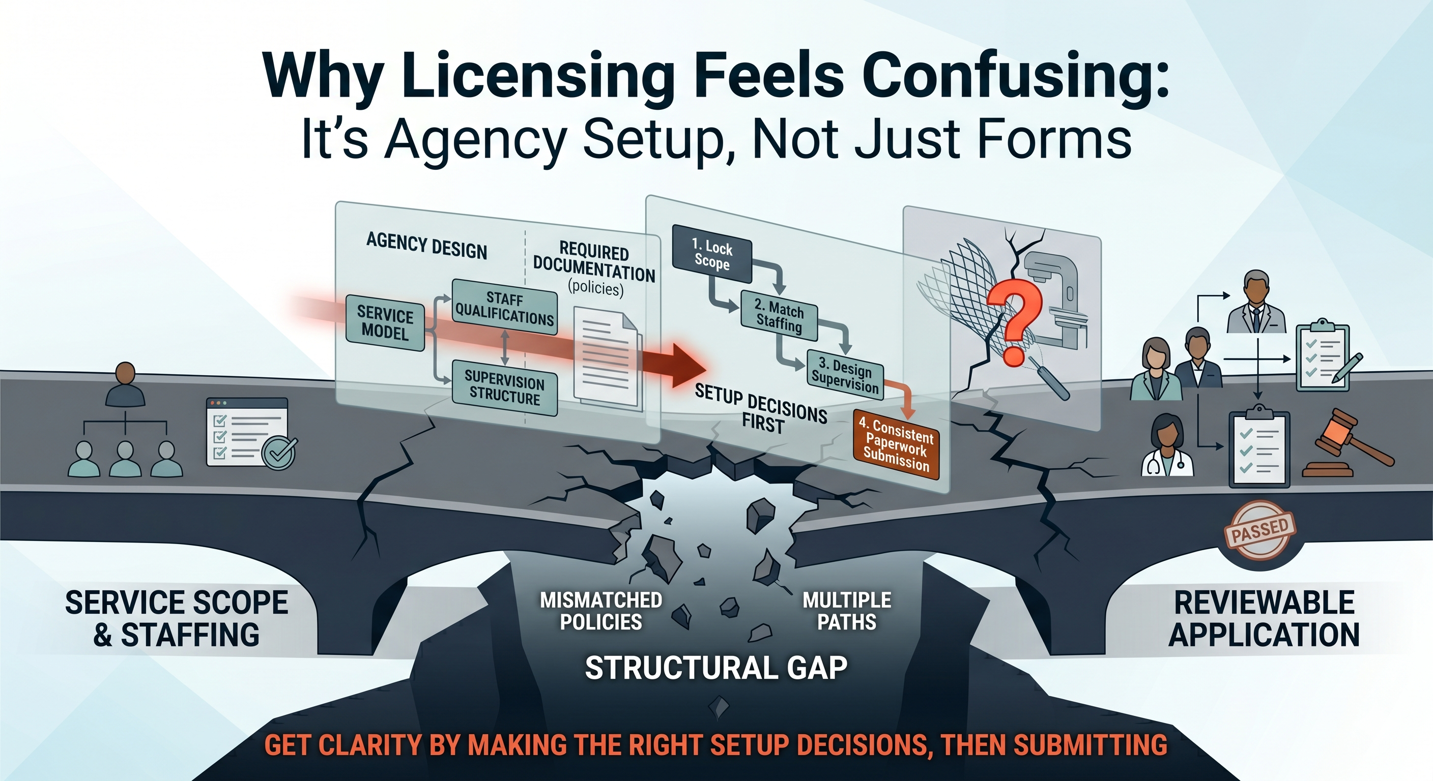 A founder told me, “I’ve started businesses before. This is the first time I feel like I’m guessing.” That’s normal. Healthcare licensing feels confusing because it’s not just an application submission. It’s a test of whether your agency is set up correctly for a specific service model—before you ever see a client. And most of the real requirements are not obvious from the forms. Licensing is confusing because it’s really about setup decisions Most founders assume licensing works like this: Fill out forms → upload documents → wait for approval. But reviewers are really asking: • What is your service scope (what you will and will not provide)? • Do your staffing qualifications match that scope? • Is your supervision structure clear and realistic? • Do your policies and other required documentation match how you’ll operate? • Does your package tell one consistent story? If any of those pieces don’t align, the file slows down or gets returned or delayed. That’s why it feels confusing: you’re doing paperwork, but the reviewer is evaluating agency design.