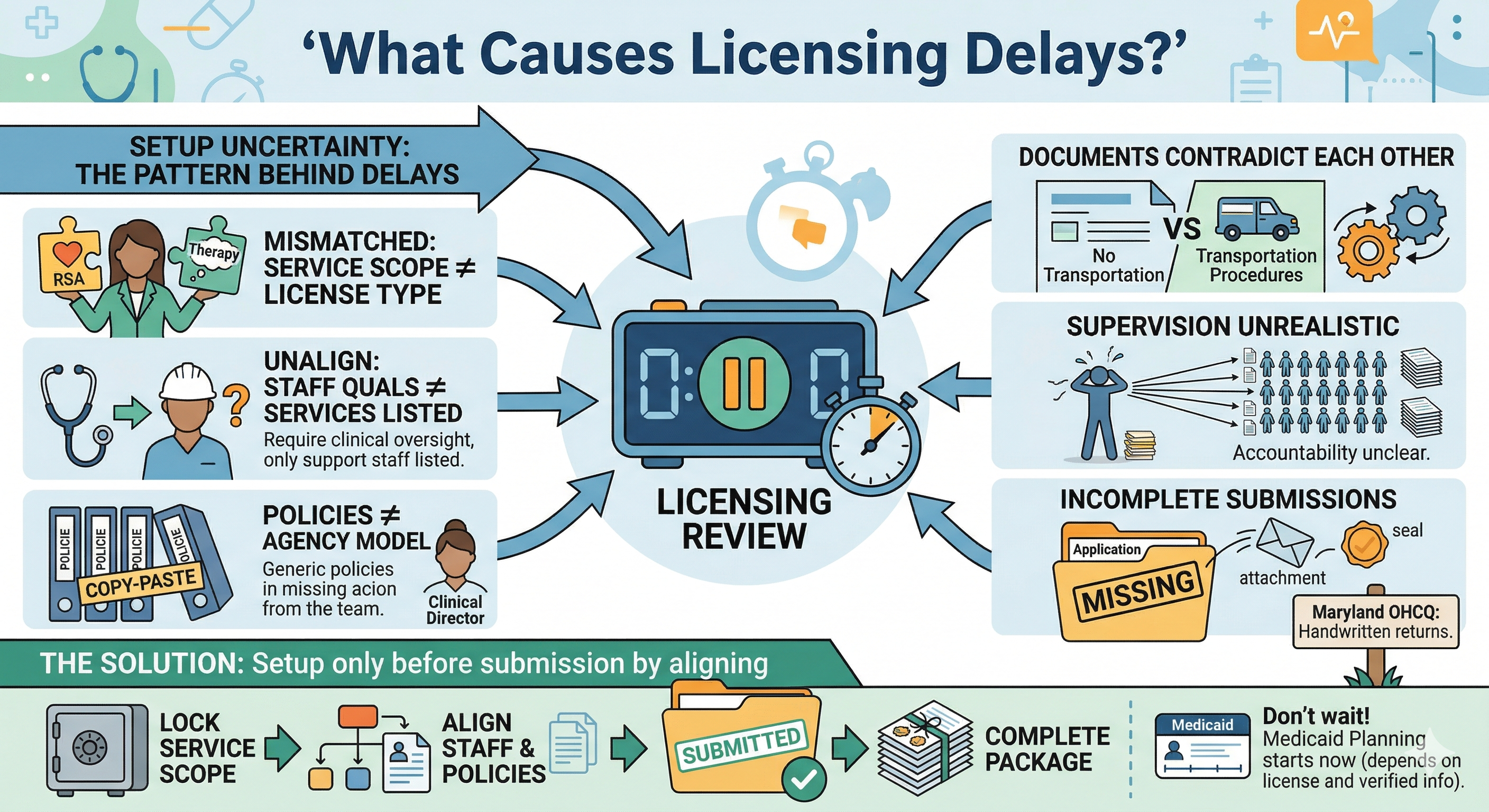 Why it delays: Contradictions force the reviewer to stop and request corrections. They can’t approve a file they can’t verify. 7) Missing attachments and “almost complete” submissions What it means: You submitted most of the package, but one required piece is missing or not in the requested format. Founder example: “We thought we could submit the main application now and add the rest later.” Why it delays: Many licensing offices treat incomplete submissions as not reviewable. For example, Maryland’s RSA application states handwritten submissions are not accepted and will be returned, and it explains the application is not complete until required materials are received. (health.maryland.gov ) 8) Medicaid planning starts too late What it means: You treat Medicaid enrollment like a post-licensing task. Founder example: “We’ll do Medicaid after we get the license.”