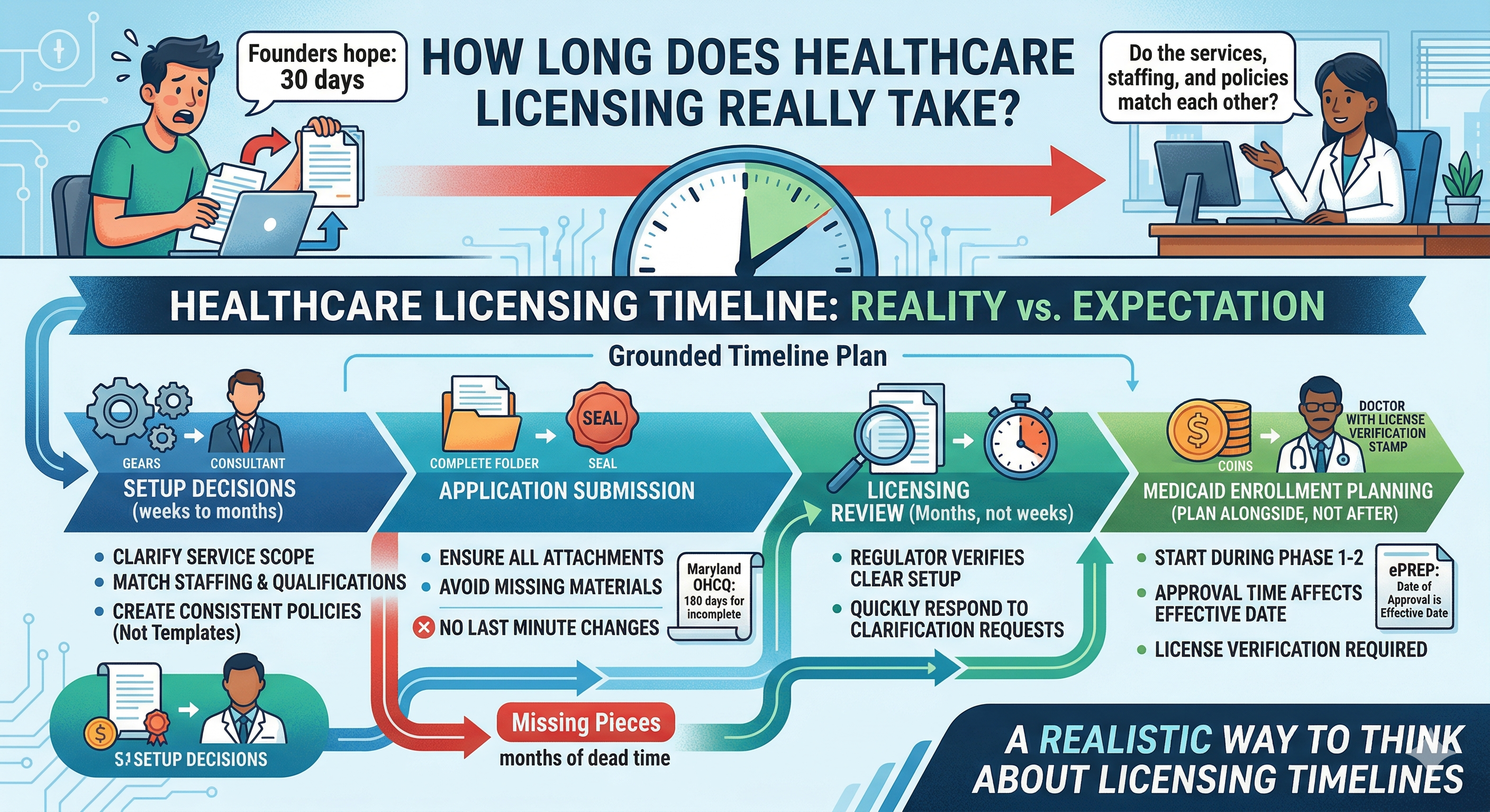 Two simple reasons: Effective date reality: Maryland’s ePREP FAQs state that the effective date is the day the application is approved, not the day it’s submitted, and approval time depends largely on submitting a complete and accurate application. License verification: Medicaid programs must verify provider licenses where applicable, which means licensing status and provider details need to be clean and consistent. Translation: if licensing drags, Medicaid revenue usually drags with it. What a grounded timeline plan looks like If you want realistic expectations, plan in phases: Phase 1: Setup decisions (service scope, staffing qualifications, supervision structure, policies) Phase 2: Application submission (complete, consistent, no contradictions) Phase 3: Licensing review (respond quickly if the regulator requests clarification) Phase 4: Medicaid enrollment planning (start during Phase 1–2, not after Phase 3) This approach doesn’t “guarantee speed.” It prevents the slowest thing in licensing: rework. The calm takeaway Healthcare licensing really takes as long as it takes to prove one thing: your agency is set up correctly for the services you’re applying to provide.