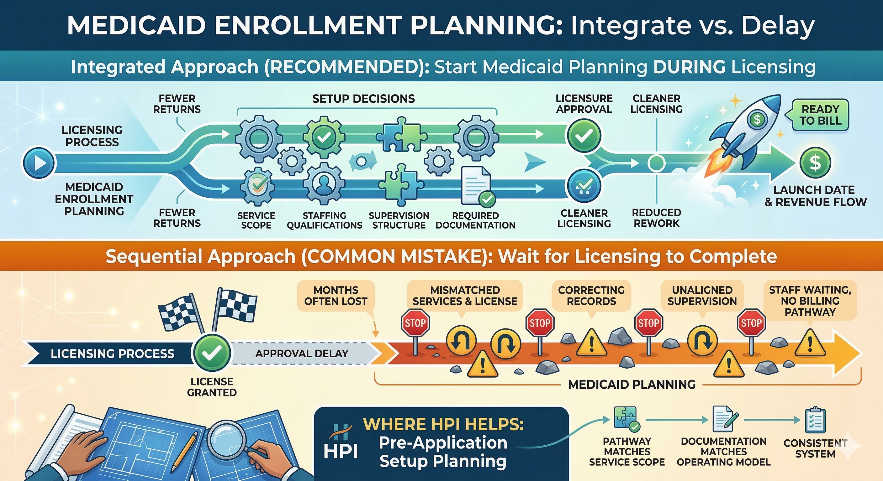 Here’s what it looks like when Medicaid planning starts too late: You get licensed, then realize the license doesn’t match the services you want to bill. Now you’re changing service scope or pursuing a different license, and Medicaid enrollment pauses. Your license is approved, but the service scope is written in a way that doesn’t clearly match the provider type you’re enrolling as. That triggers back-and-forth corrections. Your staffing qualifications don’t line up with the service model you’re enrolling under. You end up revising the supervision structure and resubmitting documentation. You planned your launch date around “license approval,” but Medicaid enrollment adds additional time. You now have staff hired and no billing pathway. The honest takeaway Licensing is the start of your approval timeline. Medicaid enrollment is often what determines your revenue timeline. If you plan Medicaid enrollment during licensing, you reduce the chance of rework—because your licensing setup is designed to support enrollment from day one. If you plan Medicaid enrollment after licensing, you’re more likely to discover mismatches that should have been fixed before the first application submission. Where HPI comes in (pre-application) This is exactly where HPI helps: setup planning before submission.