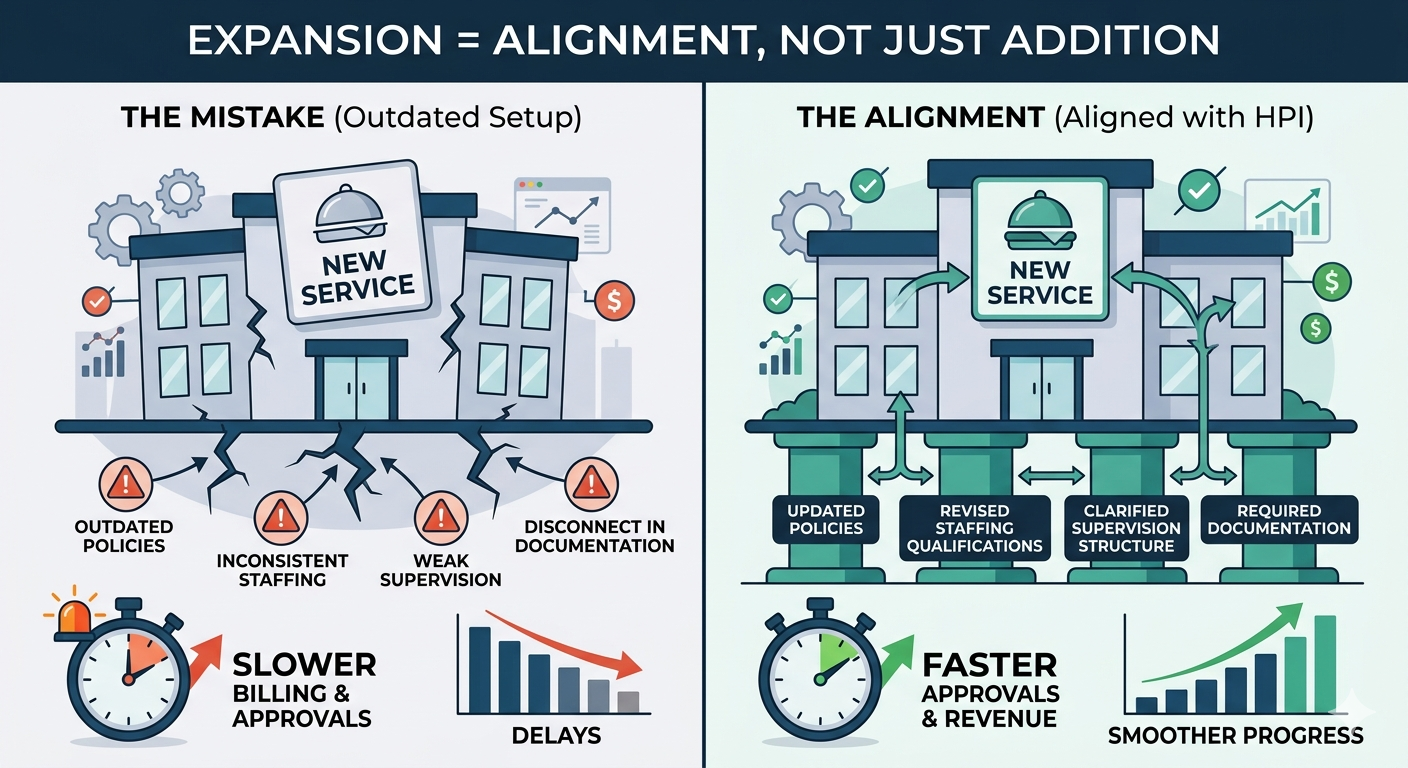 6) Your licensing and payer story must stay consistent (especially if Medicaid is involved) Even if you do not “change your license,” expanding services can still affect: • whether your services are still inside your approved scope • whether you need an update, modification, or additional approval path • whether your Medicaid enrollment profile needs updates for what you plan to bill Medicaid programs must verify provider licenses where applicable. If your licensing and enrollment story doesn’t match, updates and billing timelines can slow down. A simple expansion check (high-level) Before you add a new service, ask: • Does this service fit our current service scope as approved—or does it change what kind of agency we are? • Do we have the staffing qualifications for this service, or are we hoping to “figure it out later”? • Who supervises this service, and is that supervision structure realistic? • Do our policies clearly support this service without contradictions? If those answers aren’t clear, expansion becomes rework. Where HPI comes in (setup only) Expansion is where agencies accidentally create delays—because they add services without updating the setup. HPI helps you plan expansion the right way by aligning: • service scope to the added service • staffing qualifications and supervision structure to that new scope • required documentation so policies match what you will actually deliver • licensing and Medicaid enrollment planning so expansion doesn’t stall billing The goal is simple: expand without breaking your approvals and timelines