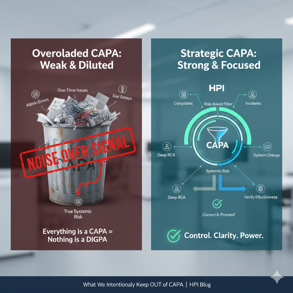 (And Why This Makes CAPA Stronger) Many organizations believe a “strong CAPA system” captures everything. In reality, the strongest CAPA systems are selective by design. At HPI, we help healthcare and regulated organizations build CAPA programs that are rare, deliberate, and powerful—not overloaded, reactive, or diluted. Effective CAPA systems intentionally exclude low-risk, one-time, or already-corrected issues. Overloading CAPA with administrative errors, non-risk documentation delays, or resolved structural issues weakens its ability to detect and correct true systemic risk. CAPA Is Not a Trash Bin for Every Issue CAPA exists to address systemic, recurring, or high-risk failures.