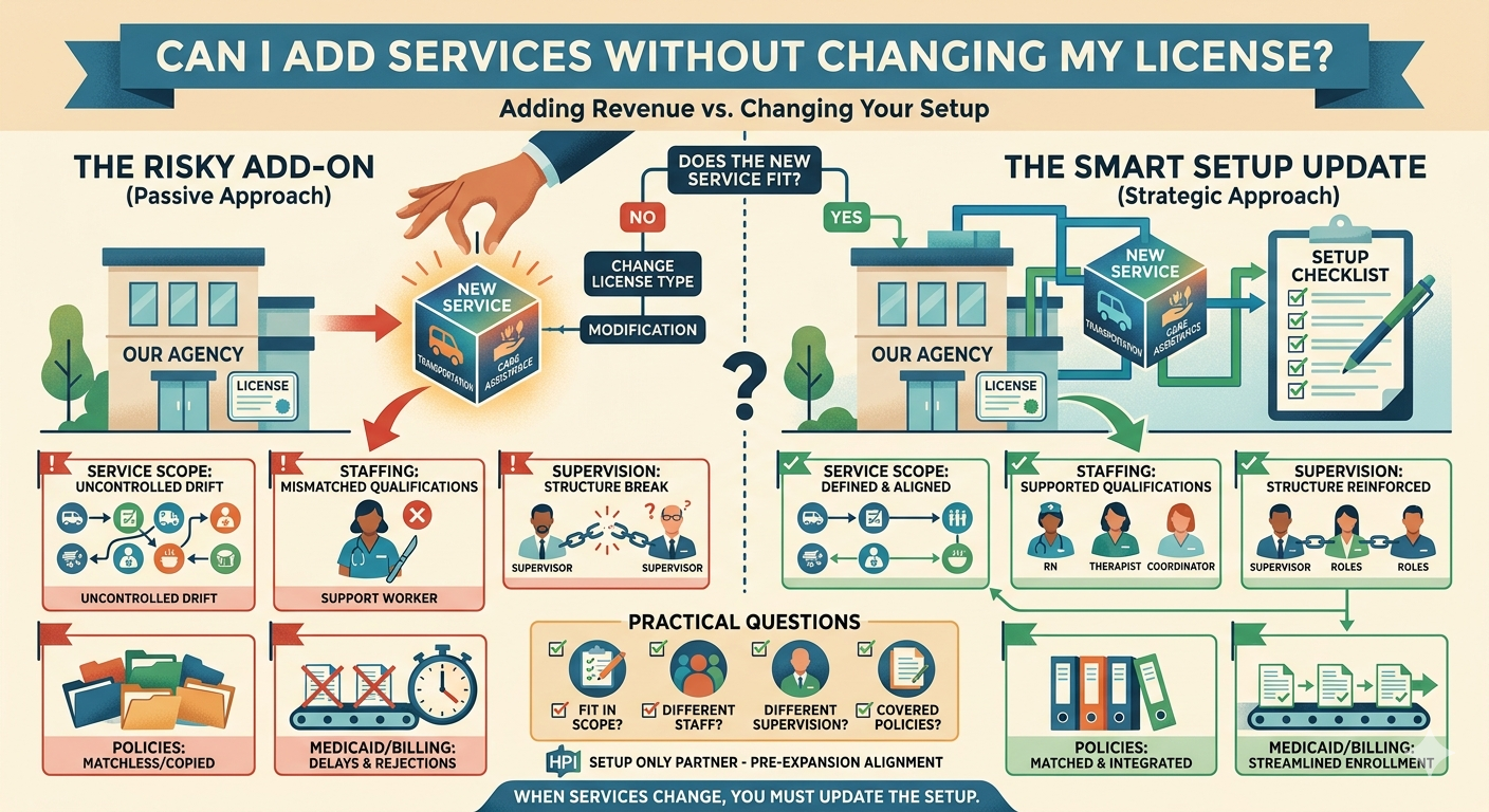 5) Medicaid enrollment and billing can get delayed What happens: You add services and plan to bill Medicaid for them, but your enrollment profile, provider type, or documentation doesn’t match the updated service scope. Why it matters: Medicaid agencies must verify provider licenses where applicable. If your licensing and enrollment story is inconsistent, enrollment updates and billing pathways can slow down. (ecfr.gov ) A practical way to decide if a service “fits” your license Before you add a service, ask these high-level questions: Does the new service fit inside our current service scope as approved? Does it require different staffing qualifications than we currently have? Does it require a different supervision structure? Do our policies and required documentation already cover it—or would we be forcing it? If the answer is “we would be forcing it,” treat it as a setup project, not a quick add-on. Where HPI comes in (setup only) Expansion is where good agencies accidentally create delays—because they add services without updating the setup. HPI supports pre-application and pre-expansion setup by helping you: