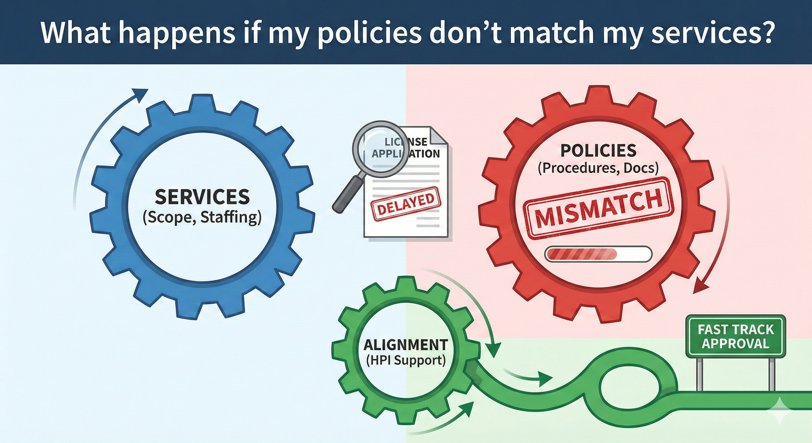 5) Policies are too generic to prove anything What it looks like: Phrases like “as needed,” “as appropriate,” and “staff will be trained” without connecting to your actual services and roles. What happens next: The reviewer can’t confirm how you will operate, so the file stalls while they request more specific alignment. Why this slows approval timelines A licensing reviewer can only approve what they can confirm from your application submission. When policies don’t match services, the reviewer can’t confidently answer: “Does this agency’s setup match the license pathway they selected?” That uncertainty is what causes the delay. Reassurance: this is fixable with proper setup Policy mismatch is one of the most common reasons applications stall, and it’s usually not hard to correct—once you treat it as a setup alignment issue. The fix is not “rewrite everything.” The fix is to align four things: Finalize your service scope (what you will and will not provide) Confirm staffing qualifications match that scope Confirm the supervision structure matches the staffing model Update policies so they reflect the real services and real staff roles When those are aligned, policies stop raising questions—and applications move faster. Where HPI comes in (pre-application) This is exactly the kind of problem HPI prevents before submission. HPI’s setup support focuses on alignment so your policies match your service scope, staffing qualifications, supervision structure, and required documentation—before you submit the first application.